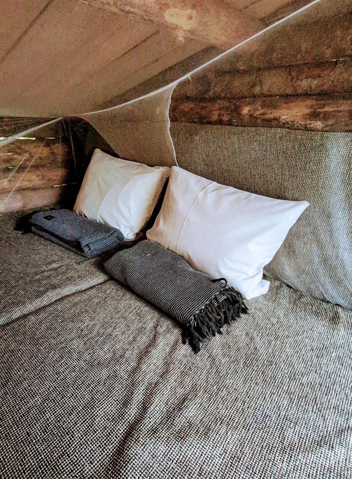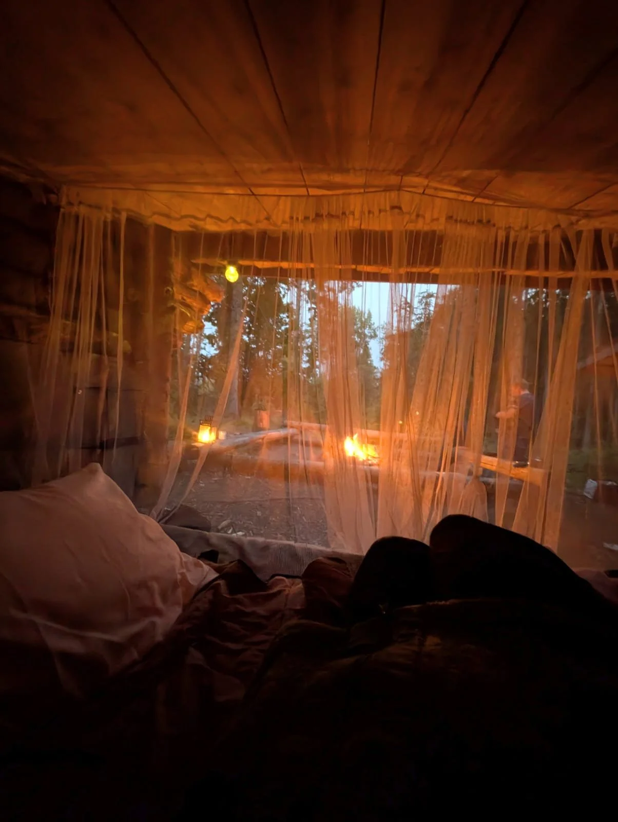 Innen warteten weiche Matratzen, dicke Decken, Kissen, Moskitonetze und sanftes Licht aus Solarlampen auf uns, draußen nur der Wald, das Knistern des Feuers und ein Himmel voller Sterne.