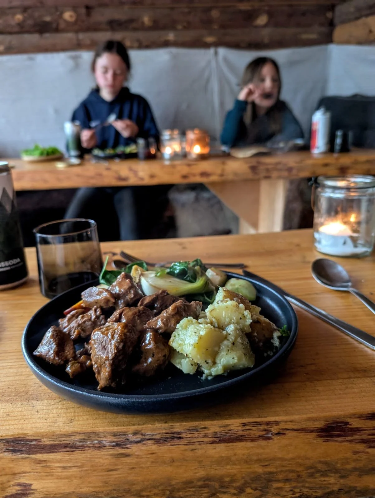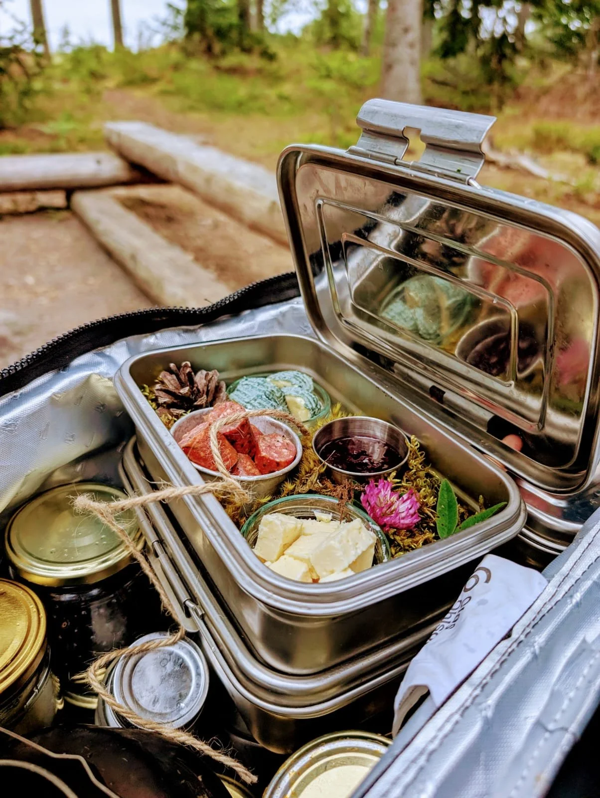 Der absolute Höhepunkt für uns war das gemeinsame Kochen über dem offenen Feuer. Besonders schön war es das man sich selbst um nichts kümmern muss. Das Menu, das man sich vorher bestellen kann, ist nicht nur regional und saisonal, es wird einem sogar ins Camp gebracht. Wer mich kennt weiß, dass ich Detailverliebt bin und so war die liebevolle Gestaltung der überlieferten Lebensmittel wirklich toll anzusehen. Das Auge isst eben mit. Für uns gab es ein Hirschragout mit Bratkartoffeln, saisonales Wurzelgemüse, Salat und zum Nachtisch eine Art über dem Feuer zubereitetes Granola mit Vanille Eis.