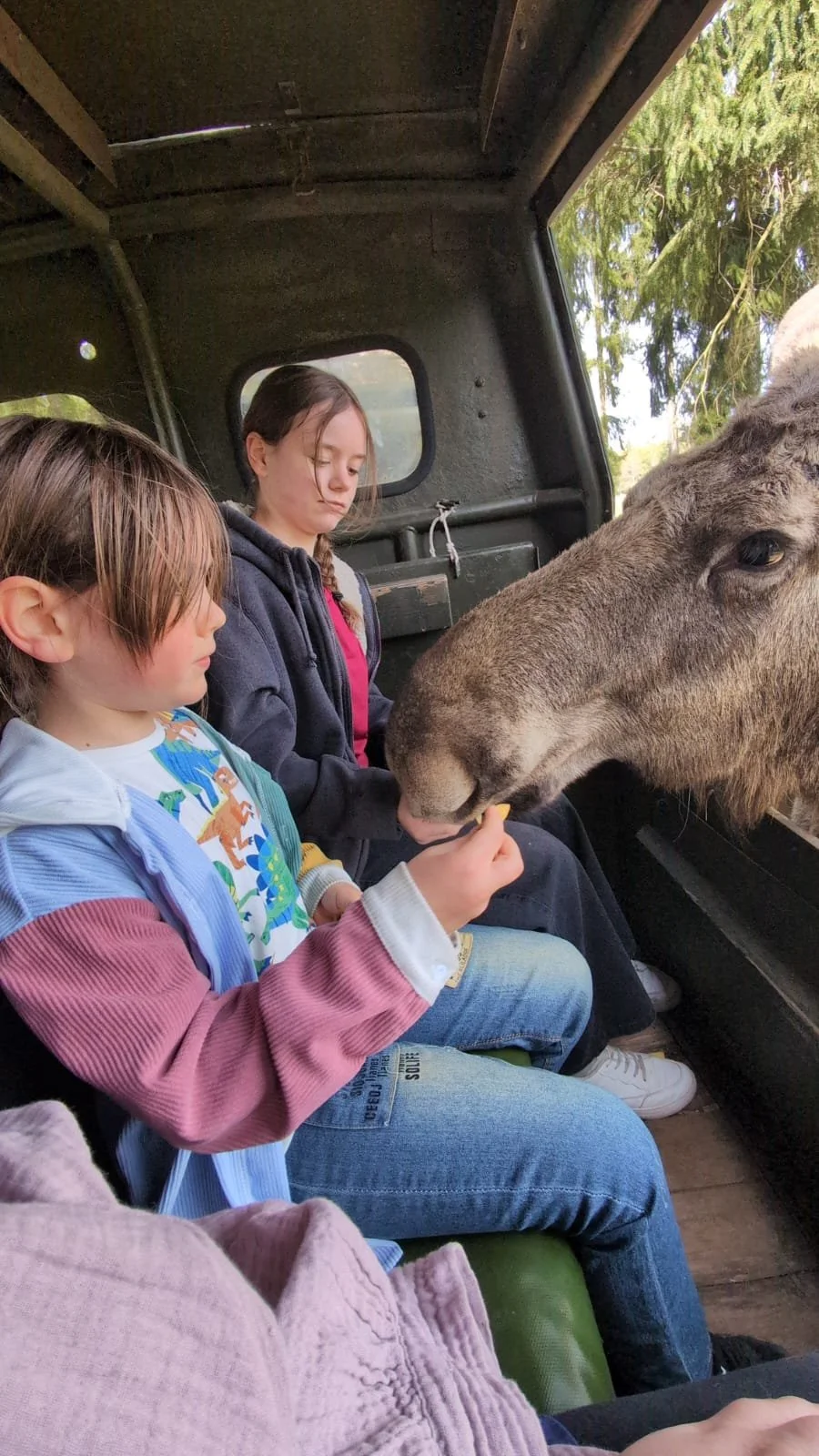 Der Höhepunkt unseres Besuchs war zweifellos die Elchsafari. Über Leitern konnten wir in die Anhänger steigen. Wenn es im Sommer voll ist, so habe ich gehört, dann kann man sogar oben auf dem Dach sitzen. Jetzt Anfang Mai war es aber noch schön ruhig und so haben wir einen Platz in einem der Anhänger bekommen, die vorneweg von einem Traktor langsam gezogen wurden. Die Elche, an die Wagen gewöhnt, kamen neugierig heran, sodass wir sie mit bereitgestellten Kartoffelstücken füttern und sogar streicheln konnten. Die Fahrt dauerte etwa eine Stunde, während der Guide interessante Informationen über die Tiere und ihre Lebensweise vermittelte, auch auf Englisch. Die Wagen sind so gestaltet, dass auch kleine Kinder sicher teilnehmen können, und es wird darauf geachtet, dass jeder die Möglichkeit hat, den Elchen nahe zu kommen. Sogar einen Elchkuss gabs für Joachim.
