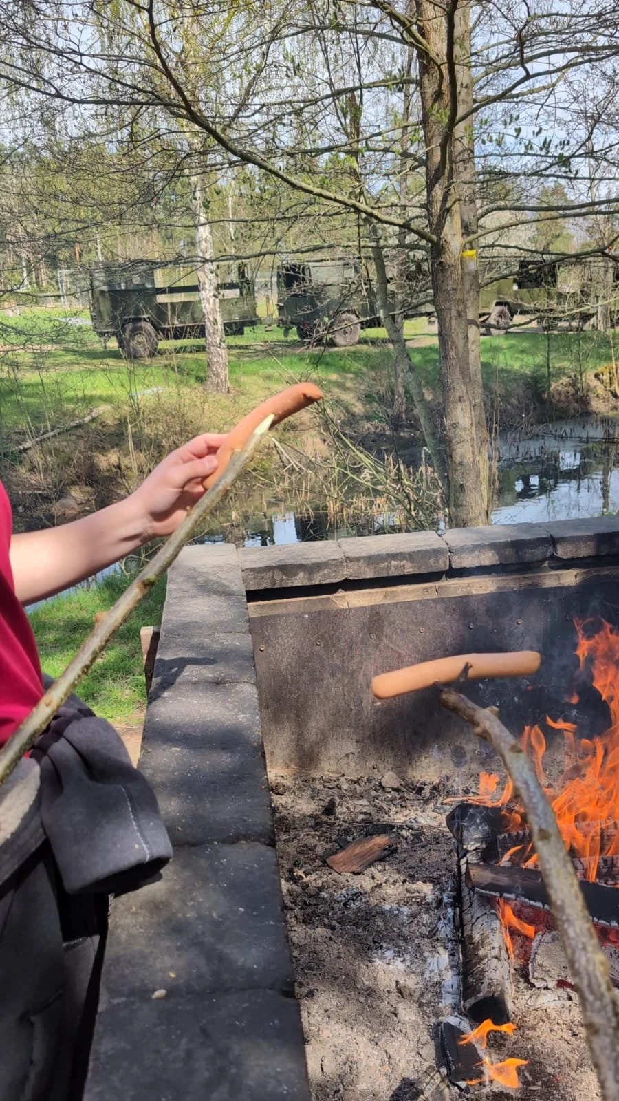 Nach der Safari hatten wir die Möglichkeit, an einer Feuerstelle Würstchen zu grillen. Im Souvenirshop konnten wir Grillwürste (sogar Elchwurst) und Brötchen erwerben und diese dann selbst über dem offenen Feuer zubereiten. Joachim übernahm das Grillen für unseren Jüngsten, denn der wollte natürlich lieber auf dem Spielplatz spielen. Dort findet man eine Schaukel, ein Klettergerüst und ein paar Sandspielzeuge. Klein aber fein.
