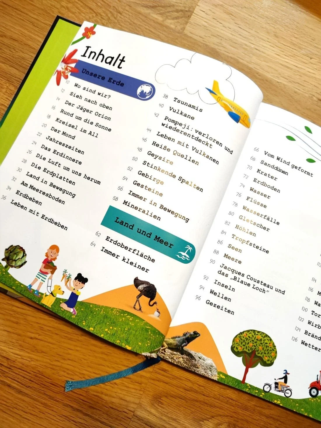 Über 200 Themen werden aufgegriffen die nochmal einzelnd unterteilt sind in "Unsere Erde" "Land und Meer" "Das Wetter" "Lebensräume" "Der Mensch" und "Rettet den Planeten".